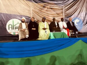 La rencontre du 7 mars 2026 a Ă©tĂ© un grand succès. Les principales personnalitĂ©s religieuses prĂ©sentes: le Cardinal Ignace Bessi Dogbo, archevĂŞque d’Abidjan, le cheikh Ousmane DiakitĂ© prĂ©sident national du COSIM : Conseil supĂ©rieur des imams, des mosquĂ©es et des affaires islamiques de CĂ´te d’Ivoire, le cheikh ChĂ©rif Oumar, Kalif de la Fayda Tidjanite de CĂ´te d’Ivoire (soufie), Mgr Charbel You Haydar, responsable de la Mission libanaise en CĂ´te d’Ivoire, le cheikh Mortada Al Khaliq, prĂ©sident de l’association islamique francophone Al Sadeq (chiite), des prĂŞtres, des imams, mais aussi, la sociĂ©tĂ© civile Ă  travers Mme la ministre Euphrasie Kouassi Yao, titulaire de la chaire Unesco, « eau, femmes, et pouvoir de dĂ©cisions », laquelle retenue par la journĂ©e des femmes au dernier moment, a donnĂ© son apport en Visio. Des interventions fortes, des psalmodies, prières et textes respectifs, invocation commune, chants d’enfants, lâcher de colombes…